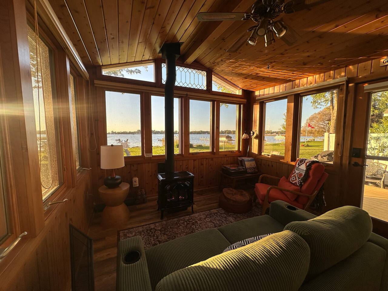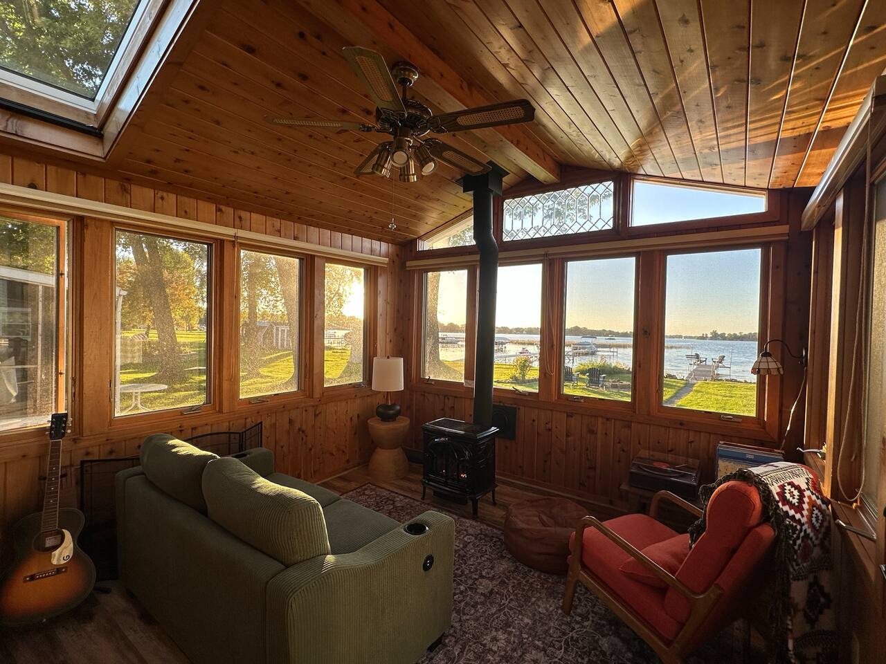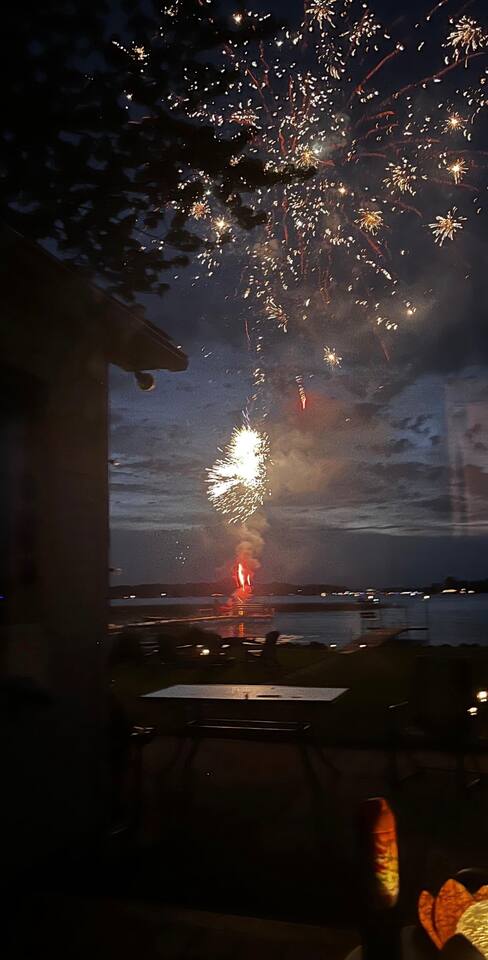 🛋️Cozy up by the fire on the spacious sectional in the living room, featuring a bay window with a panoramic lake view, a warm fireplace, and a 4K Roku TV. 🌅 Enjoy more panoramic views from the four-season sunroom, complete with a Jotul gas fireplace and record player. 🌺 Fresh décor, new flooring and bathrooms. 😴 Rest easy in brand-new beds with plush bedding. 🛏️ Bedroom 1: King bed, 4K Roku TV, blackout drapes, ceiling fan. 🛏️ Bedroom 2: Queen bed, 4K Roku TV, blackout drapes, ceiling fan. 🛏️ Sleeping area/ Bunk room twin over twin: located in a common area with limited privacy. Dock Use: 🎣 Our 50-foot private dock is available for guest use from May - October (check with host for exact dates, weather dependent ) It's great for fishing and relaxing. Water depth is about 2 feet midway and 3 feet at the end. See “other details” for more notes on dock and boat use. 🔥 Fire pit, gas grill, cozy outdoor seating and dining areas are yours to enjoy. 🎆 Incredible Fourth of July and New Year’s Eve Fireworks visible from dock!